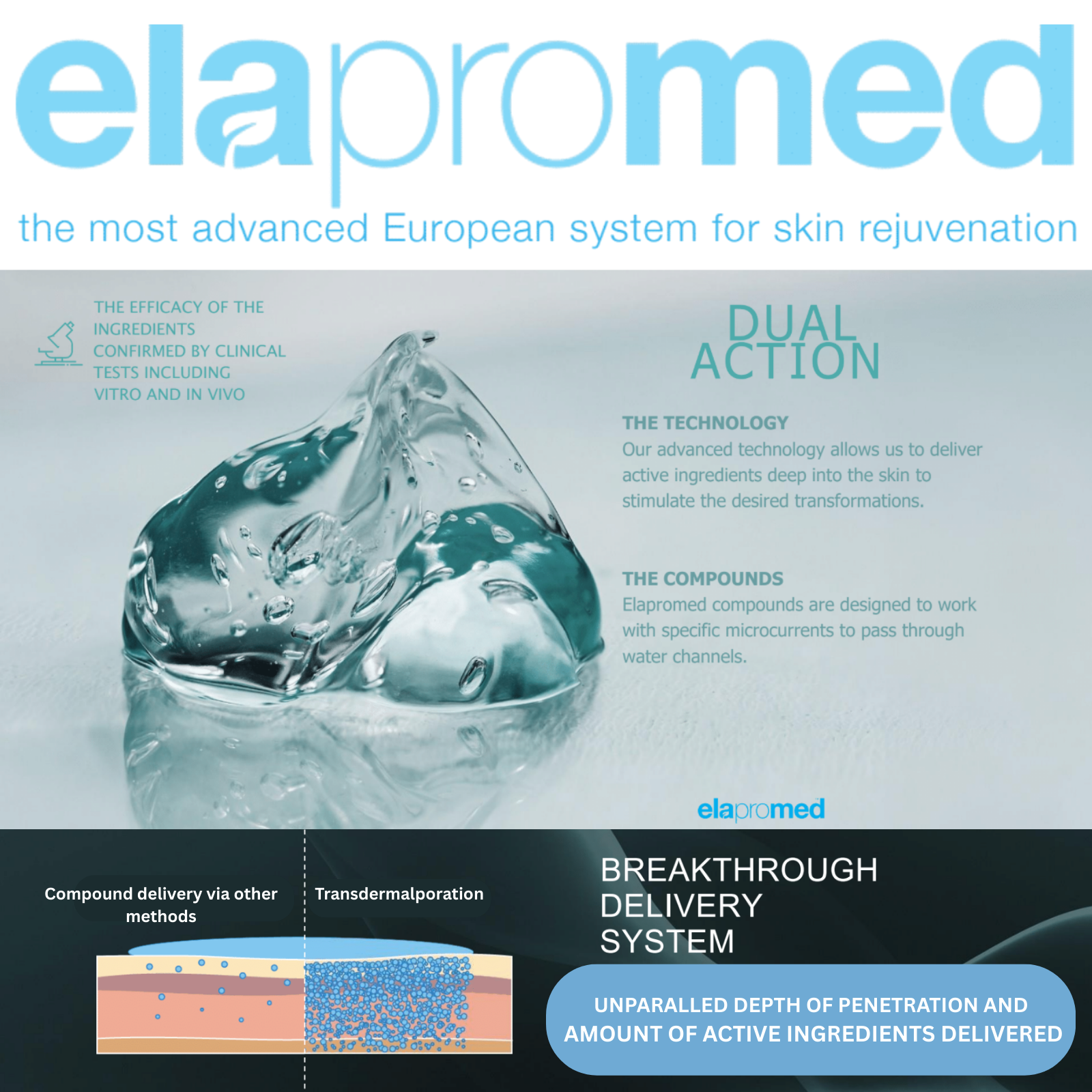 Based on the nobel-prize winning discovery of electroporation (which is used in the medical field to treat illnesses by introducing healing molecules directly into damaged cells [pubmed]), Elapromed developed a skin-centric machine which enables the delivery of a wide range of specific, and always condition-driven, active organic compounds, stem cells, and nutraceuticals directly into the dermal cells to produce a profound response [5]. Micro-current stimulation at the cellular level enables muscle toning, draining of liquids from intercellular space, enhances production of new collagen and elastin — resulting in firming/lifting, and generating a Botox-like effect. This technology provides a greater than 90% active compound penetration rate, while most delivery systems will only penetrate up to 10% of active substances into the skin. [6] [7]